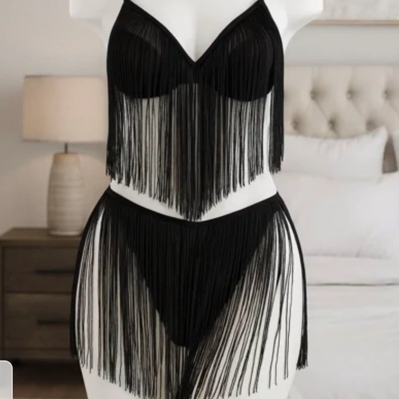 ست سوتین فنردار ریشهای با طراحی کاپ باز و آویزهای بلندرقصان، ترکیبی از جسارت و ظرافت در یک قاب خاص🥰