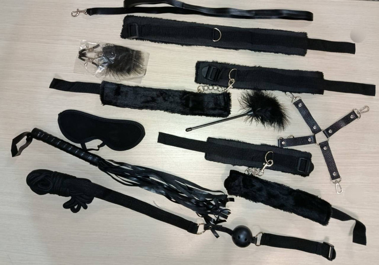 چشم بند ، چوکر گردن، دهان بند گگ بال ، شلاق، مچ دست بند ، مچ پا بند ، پر نوازش ، طناب، گارتر ضربدری و اتصالات👌🏻